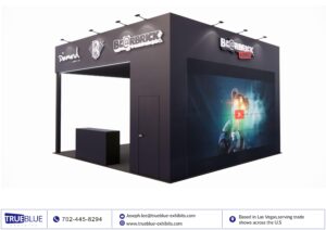 Rental Exhibits provided by TrueBlue Exhibits show modular integrity across varying booth sizes. Panels align with graphic elements without interruption. Storage compartments remain concealed. The result is a structure that does not distract from the merchandise or demonstration areas.