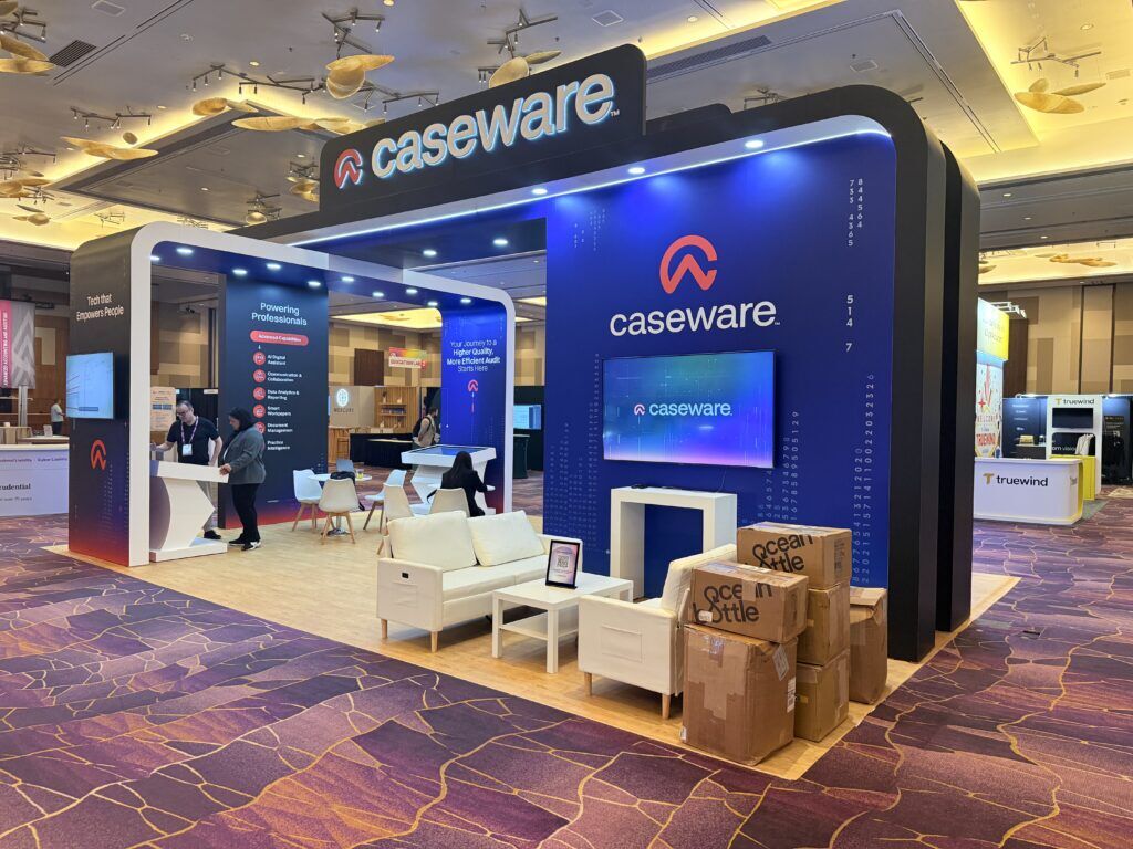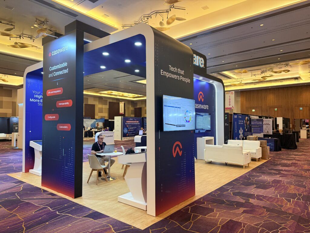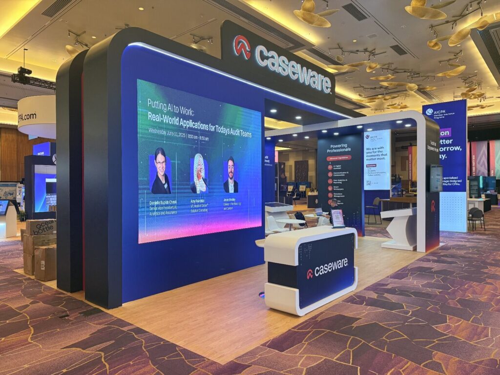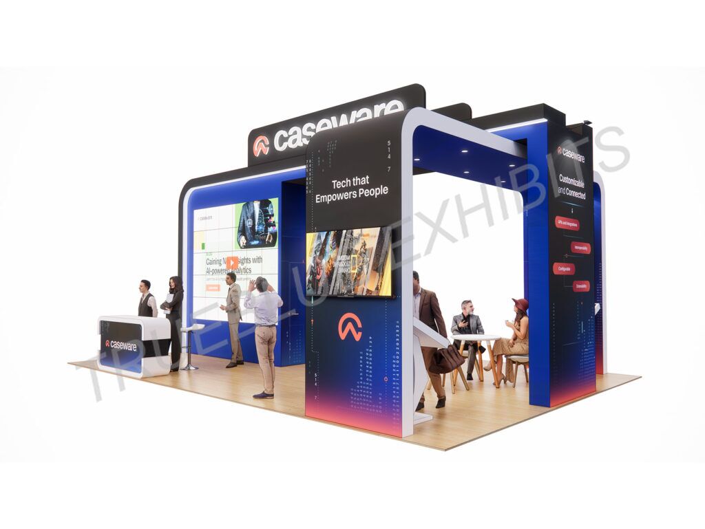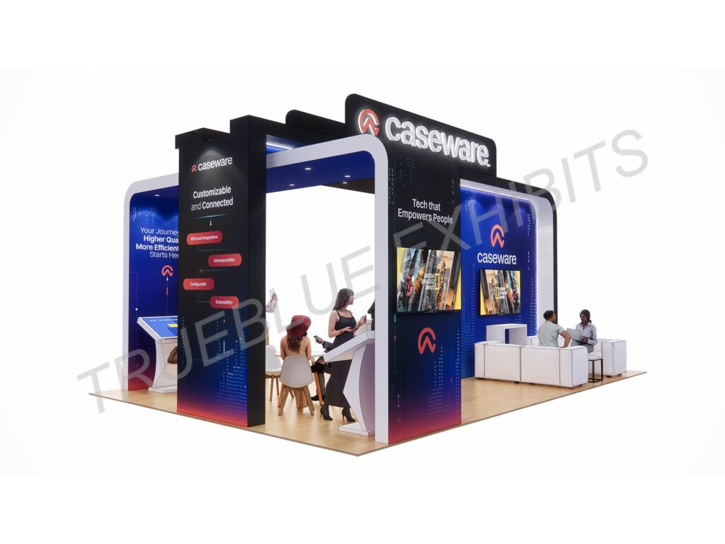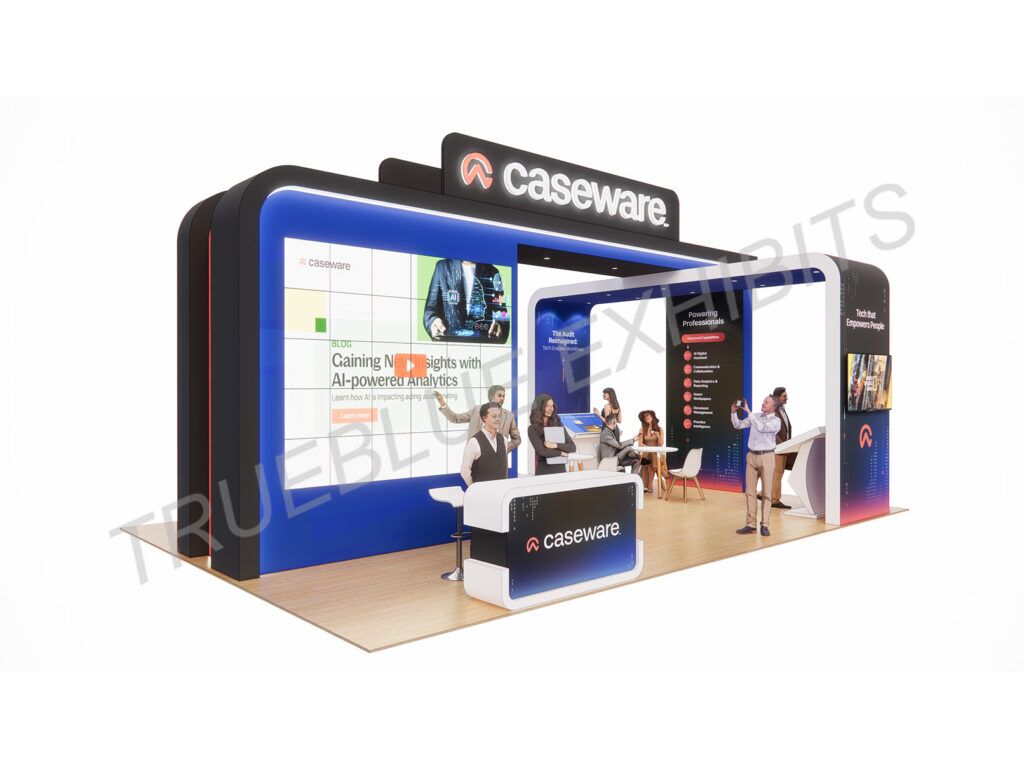 Locate the Caseware 20′ x 30′ Engage 2025 Las Vegas Arch Trade Show Booth, created by TrueBlue Exhibits. Eye-catching and open design, this booth has a striking arch stand that draws attention from all sides, achieving maximum brand exposure on the floor. Interactive demo zones, high-definition graphics, and large LED video wall enhance guest engagement and create an experience that will not be forgotten. Ideal for product showcases, pitches, and schmoozing, the booth combines aesthetics with functionality. Let TrueBlue Exhibits deliver turnkey exhibit solutions at Engage 2025 Las Vegas—where innovation and design excellence merge in every square ft.