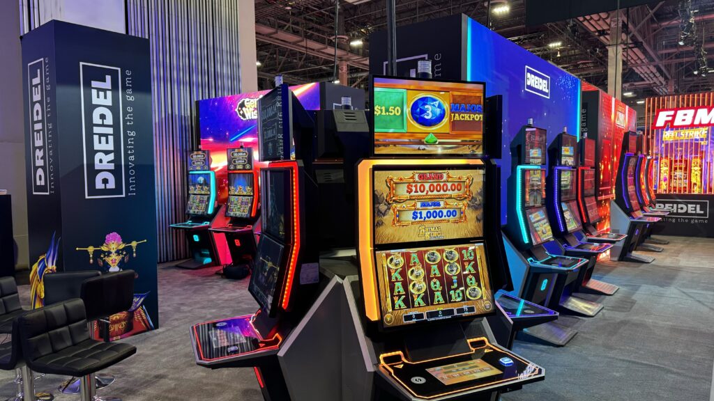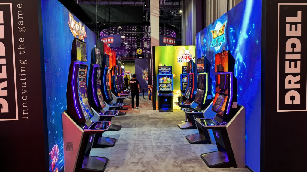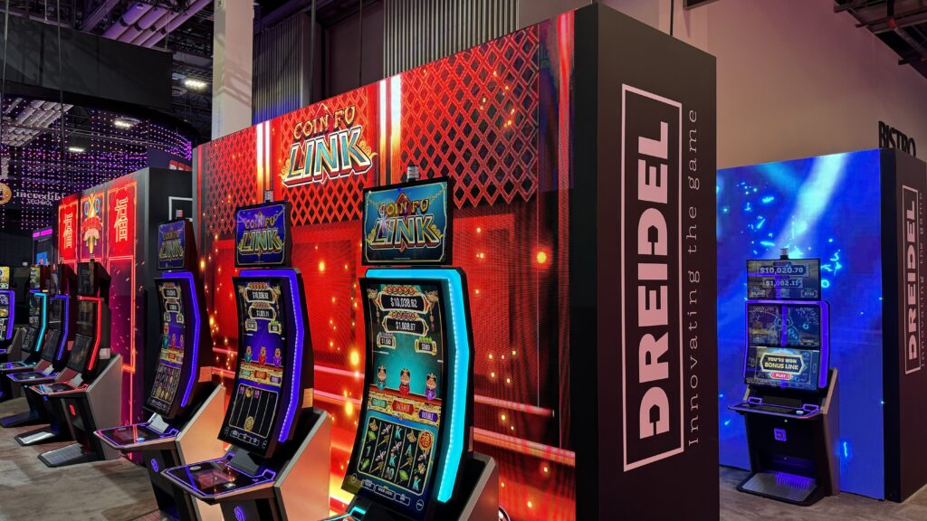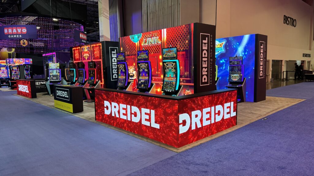 The DREIDEL 50′ x 30′ Custom LED Video Wall Booth at G2E Las Vegas 2023 was designed and serviced by TrueBlue Exhibits. We offer an innovative and visually stunning custom trade show booth + LED video wall display solution for trade shows and events. This booth consists of 8 x 13ft x 10ft P2.6 LED video wall with both end caps and 2 x L shape front screen was an innovative design first seen on Las Vegas show floor. The booth successfully captured attendees’ ultimate attention with vibrant LED wall visuals and dynamic video content. TrueBlue Exhibits provides top-of-the-line trade show booth design and services in Las Vegas to create a lasting impression for business brands and make them standout at show floor. Contact us to get complimentary booth design and start your project today.