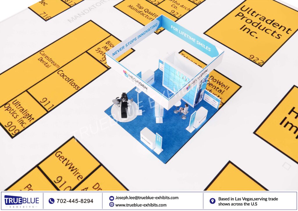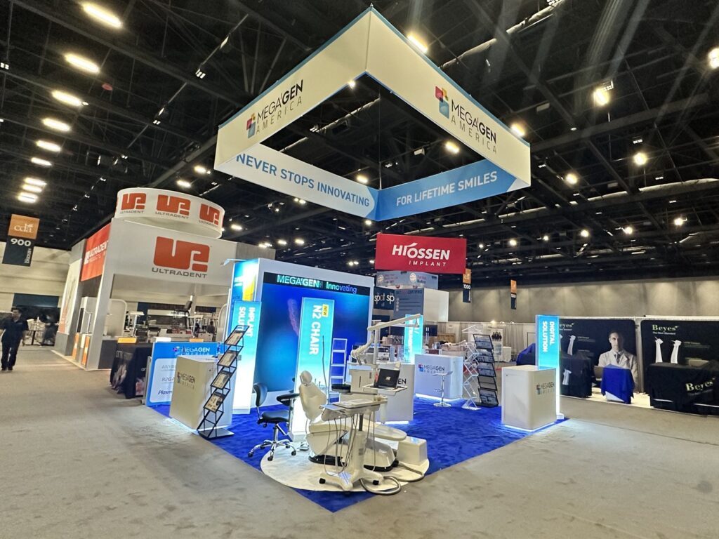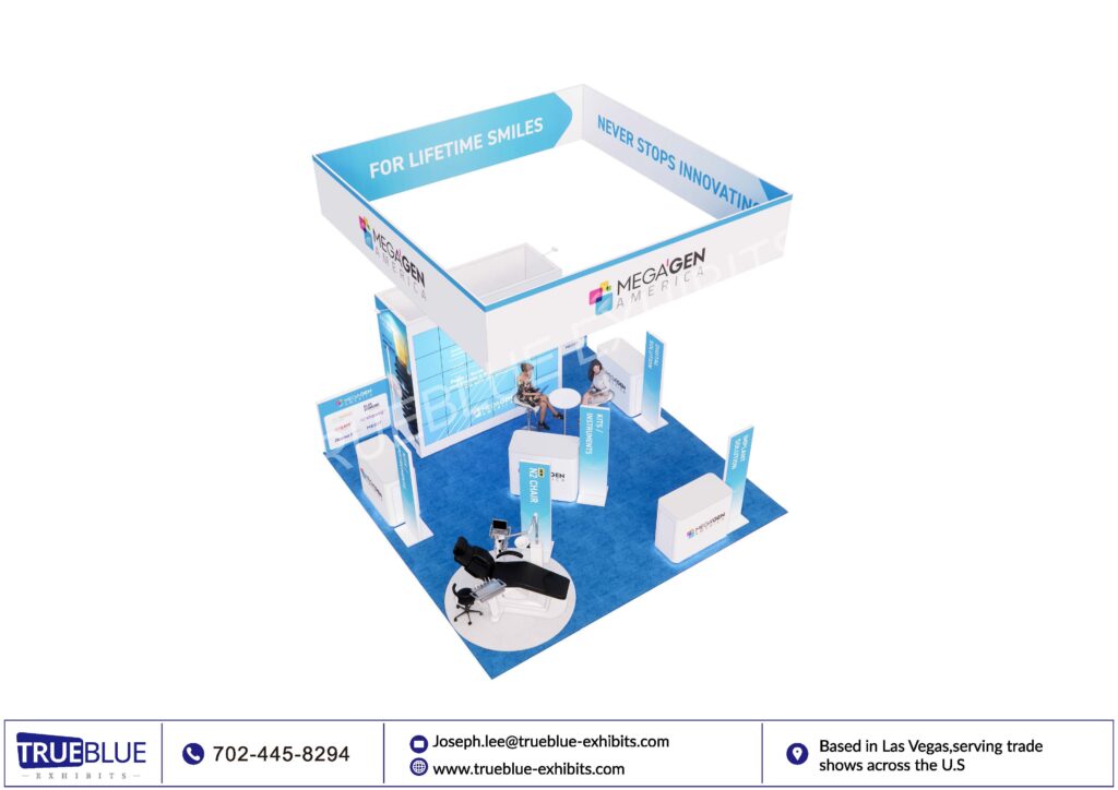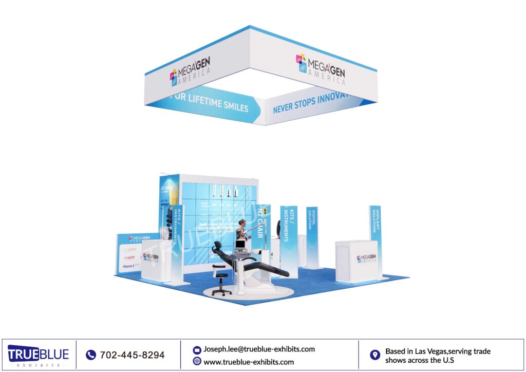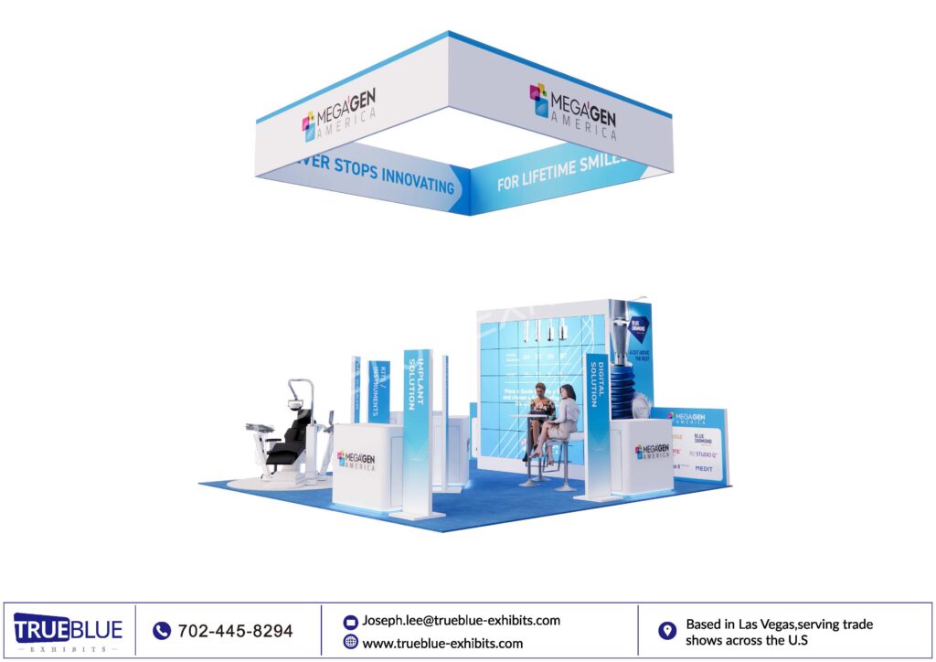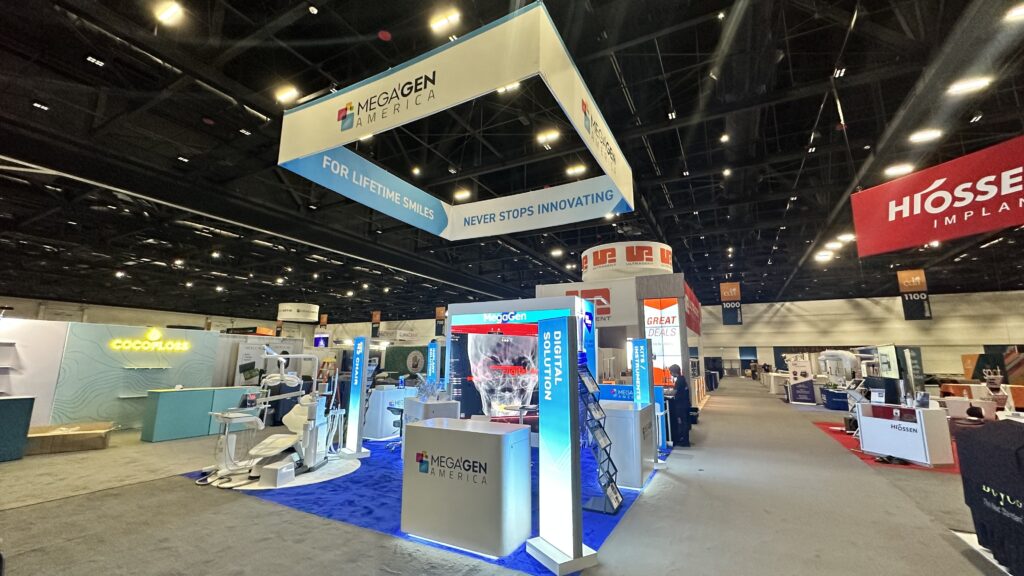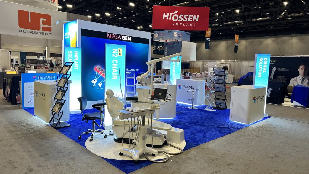 Take a look at MegaGen America’s stunning 20′ x 20′ CDA San Jose booth! Our LED Video Wall creates an immersive experience, showcasing our cutting-edge dental solutions in vivid detail. But that’s not all – our bright lightbox poster illuminates your product message, making your booth impossible to miss. With TrueBlue Exhibits handling the turnkey booth services, you can rest assured that your booth will be a standout success!