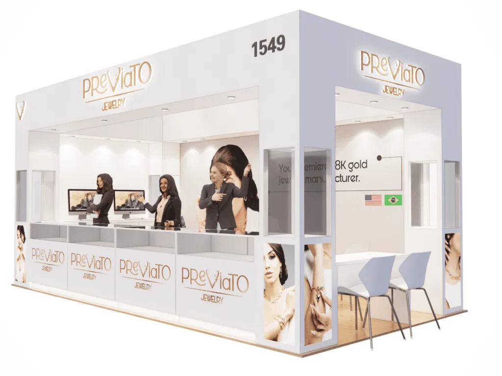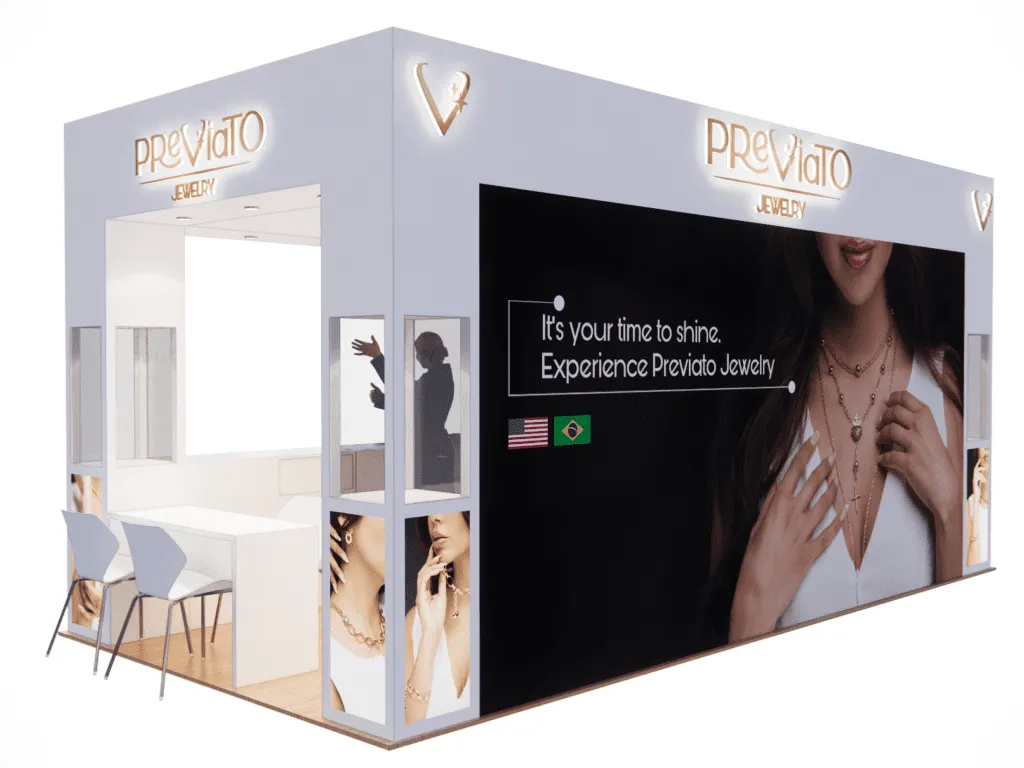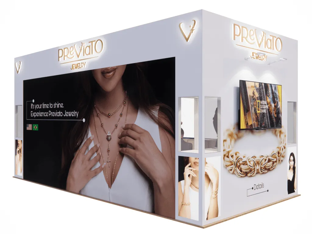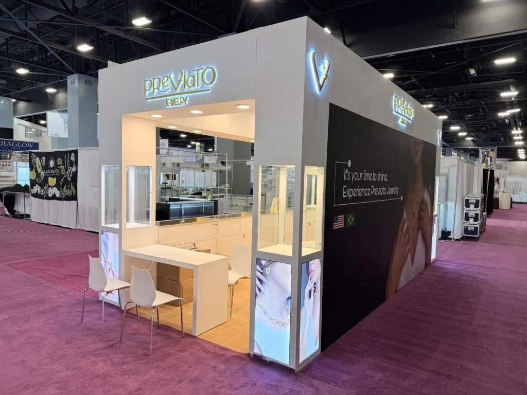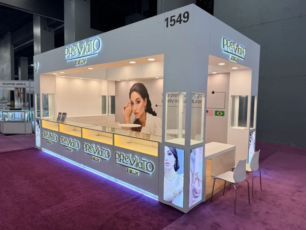 Previato Jewelry showcased a stunning custom 10′ x 20′ exhibit rental at the JIS Fall Show in Miami, provided by TrueBlue Exhibits. This beautifully designed booth highlighted Previato’s luxurious jewelry collection, capturing attention with its elegant layout and high-quality craftsmanship. TrueBlue Exhibits ensured a seamless display experience, offering bespoke features tailored to Previato’s brand image. The booth’s strategic lighting and inviting design enhanced customer engagement, making it a key attraction at the JIS Fall Show. Elevate your brand’s presence with custom exhibit rentals from TrueBlue Exhibits for standout success at your next trade show.