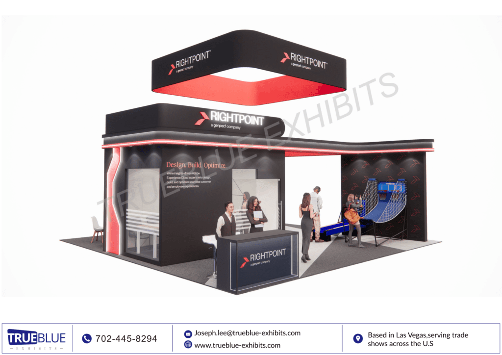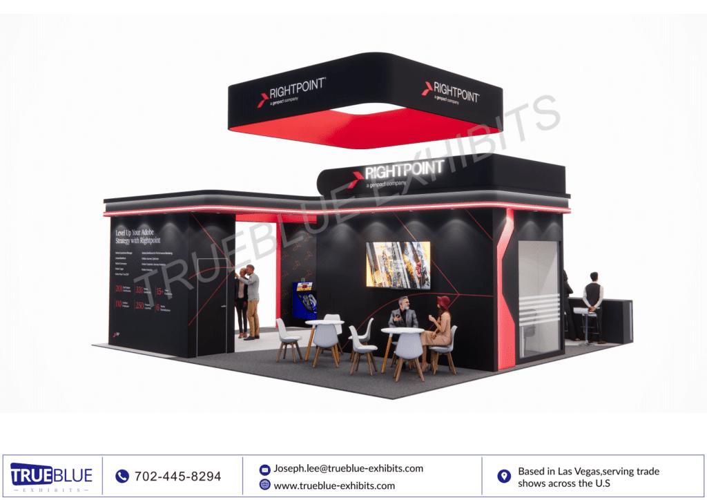 TrueBlue Exhibits offered turnkey service for RightPoint`s Adobe Summit trade show booth, featuring a sleek and customized 30′ x 30′ design. Our expert team handles every aspect, from concept to execution, ensuring RightPoint`s booth stands out amidst the crowd. With attention to detail and a focus on RightPoint`s brand unique identity, we create immersive experiences that leave a lasting impression on trade show attendees. Our comprehensive service includes design, booth fabrication, exhibit transportation, display labor installation & dismantle, guaranteeing a stress-free experience for exhibitor. Elevate your presence at trade show floor with TrueBlue Exhibits’ seamless solutions, designed to maximize your trade show impact and drive meaningful connections.