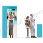 This custom trade show booth design offers a reception counter and a functional back wall, perfect for showcasing your branding, messaging, and graphics, along with a storage solution. It comes equipped with a TV screen, allowing you to display dynamic visuals and video content to capture the attention of your visitors.