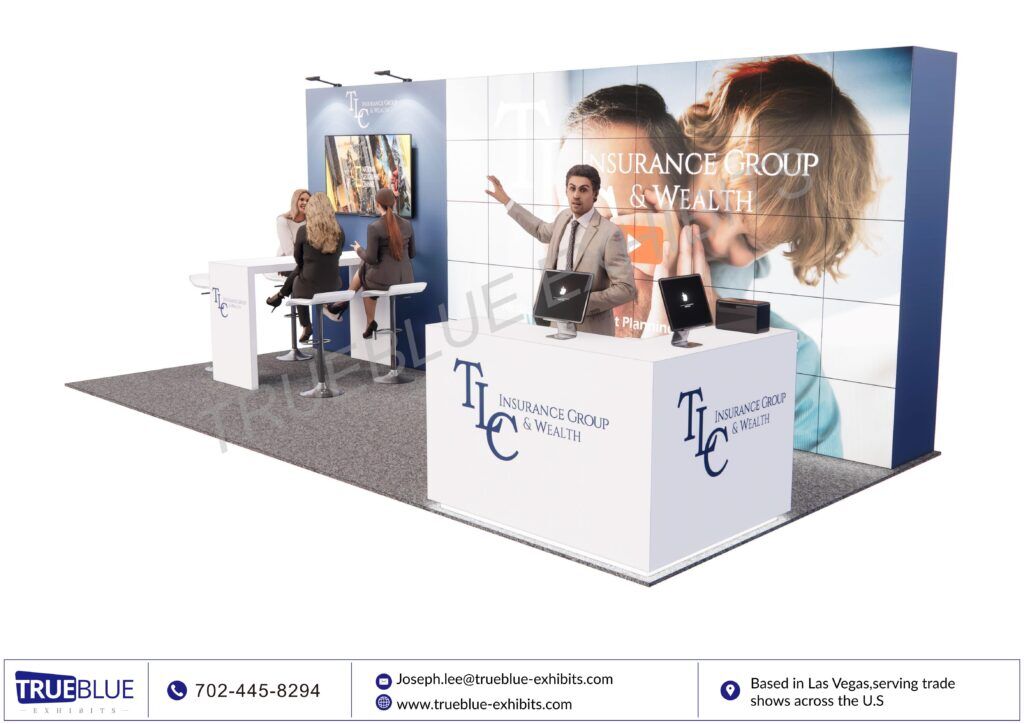At Medicarians, TLC Insurance Group makes a bold impression with a sleek 10′ x 20′ custom booth by TrueBlue Exhibits. Designed for maximum impact, this exhibit features a stunning LED video wall that brings TLC’s message to life with vibrant visuals and dynamic storytelling. The modern, open layout invites attendees in, while smart branding elements ensure TLC’s expertise shines through. TrueBlue’s high-quality LED video wall equipment & exhibits and turnkey service guarantee a seamless, polished presentation – helping TLC connect, engage, and stand out.