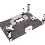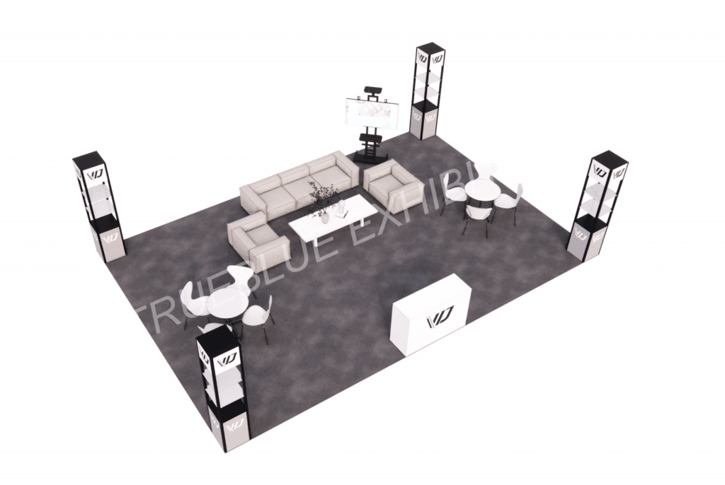This minimalist 20’ x 30’ exhibit booth design might be just what you need. The layout features four tower showcases at each corner, stylishly displaying your products and drawing more visitors. Functional and visually appealing, the booth includes comfortable seating, such as sofas and tables. A TV screen can be mounted near the seating area for visual presentations. Additionally, a customizable reception counter at the front can be tailored to match your brand’s image.